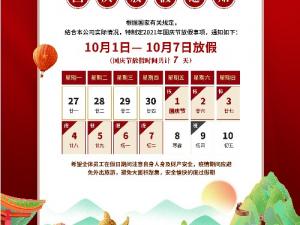 親愛的各位同事: 國慶節(jié)、中秋節(jié)即將到來,放假時(shí)間為10月1日—10月8日,共計(jì)8天,9月27日與10月10日需正常上班(呼叫中心部門按正常排班班次出勤)。  ..